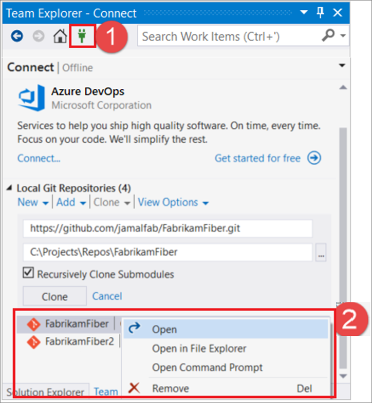 The Git experience should automatically connect to the correct Azure DevOps repo based on the repository or solution you opened. However, if you need to manually connect to the repo, you can still do that by using Team Explorer. From the Visual Studio menu bar, select View > Team Explorer > Manage Connections > Connect.