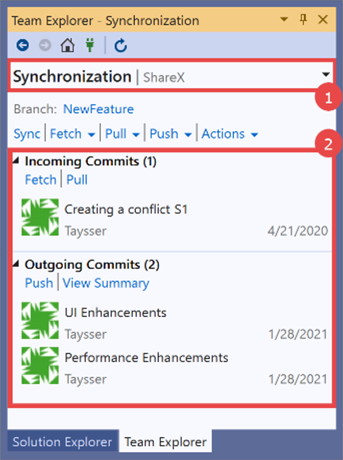 View Incoming and Outgoing commits Screenshot of the Synchronization window for Team Explorer in Visual Studio 2019, with a 'view incoming and outgoing commits' procedure overlay.