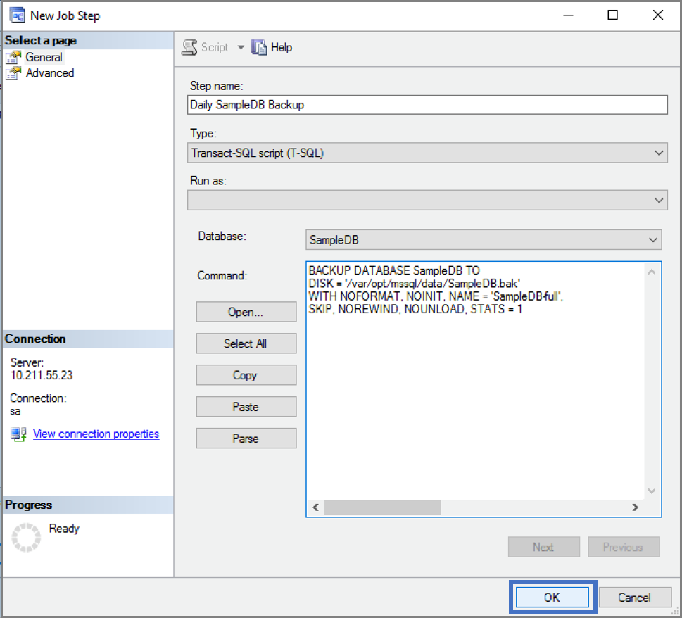 SampleDBbazy danych.EXECUTE sp_add_jobstep @job_name = N'Daily SampleDB Backup', @step_name = N'Backup database', @subsystem = N'TSQL', @command = N'BACKUP DATABASE SampleDB TO DISK = \ N''/var/opt/mssql/data/SampleDB.bak'' WITH NOFORMAT, NOINIT, \ NAME = ''SampleDB-full'', SKIP, NOREWIND, NOUNLOAD, STATS = 10', @retry_attempts = 5, @retry_interval = 5; GONastępnie utwórz dzienny harmonogram zadania przy użyciu sp_add_schedule.