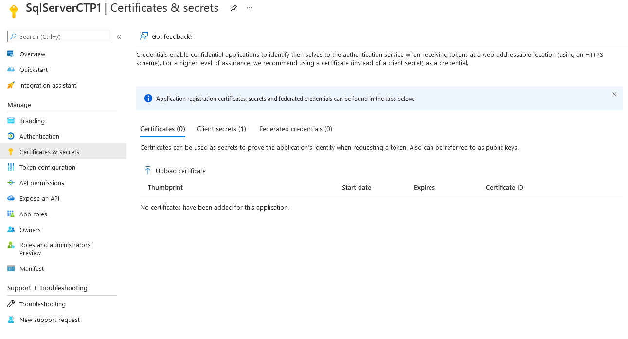 W portalu Azure przejdź do utworzonej powyżej rejestracji aplikacji i wybierz listę Certyfikaty