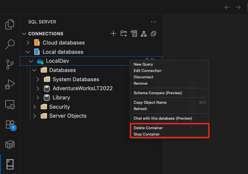 Funkcja kontenera Lokalnego programu SQL Server w rozszerzeniu MSSQL dla programu Visual Studio Code umożliwia tworzenie kontenerów programu SQL Server i zarządzanie nimi bez ręcznego uruchamiania poleceń platformy Docker. Kontenery można wdrażać, uruchamiać, zatrzymywać i usuwać bezpośrednio z widoku Połączenia , zapewniając prosty sposób tworzenia prototypów, tworzenia i testowania obciążeń przy użyciu tego samego aparatu bazy danych dostępnego w środowiskach produkcyjnych.