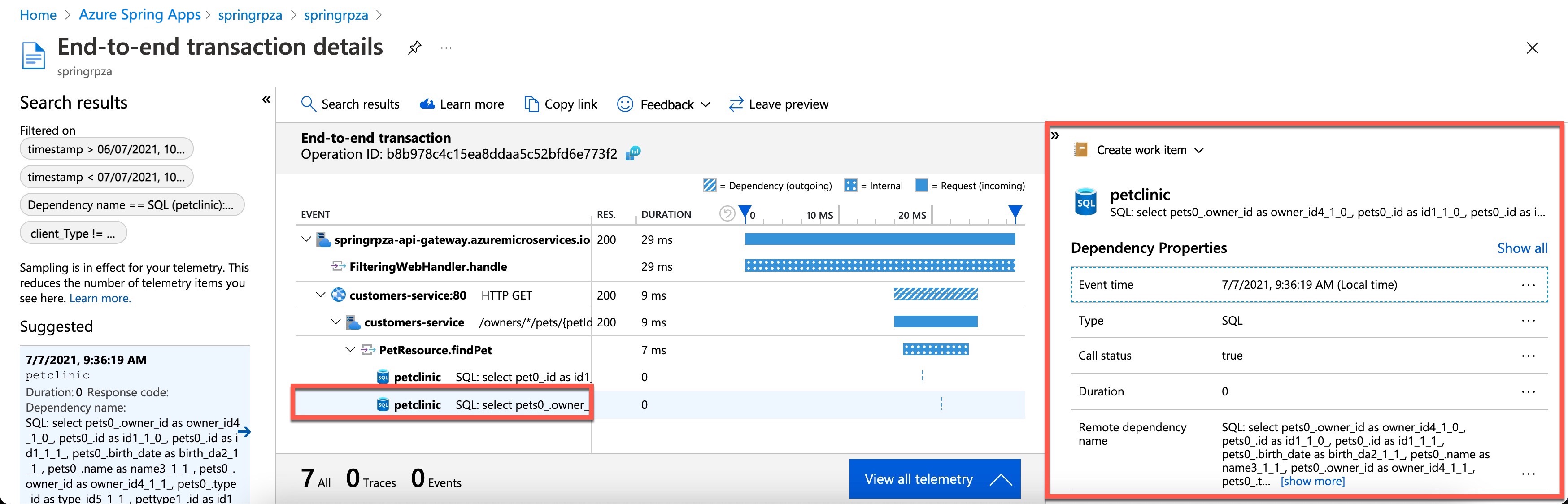 Na koniec w widoku Szczegóły transakcji end-to-end wyświetl przykładową transakcję instrukcji SQL, wybierając instrukcję SQL: