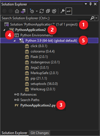 Program Visual Studio używa pogrubienia, aby zidentyfikować, który plik jest plikiem startowym dla programu. W tym przykładzie masz tylko jeden plik .py (3).