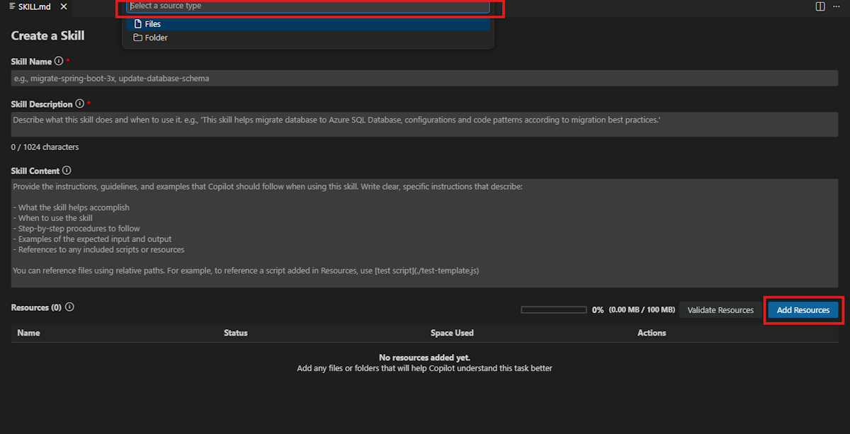 Os arquivos selecionados são copiados para .github/skills/<skill-name>/ em seu projeto. Arquivos e pastas de recursos são armazenados ao lado de SKILL.md na pasta de skills. O tamanho total do recurso é limitado. Faça referência a esses arquivos ou pastas pelo nome no campo Skill Content para que Copilot saiba quando usá-los.