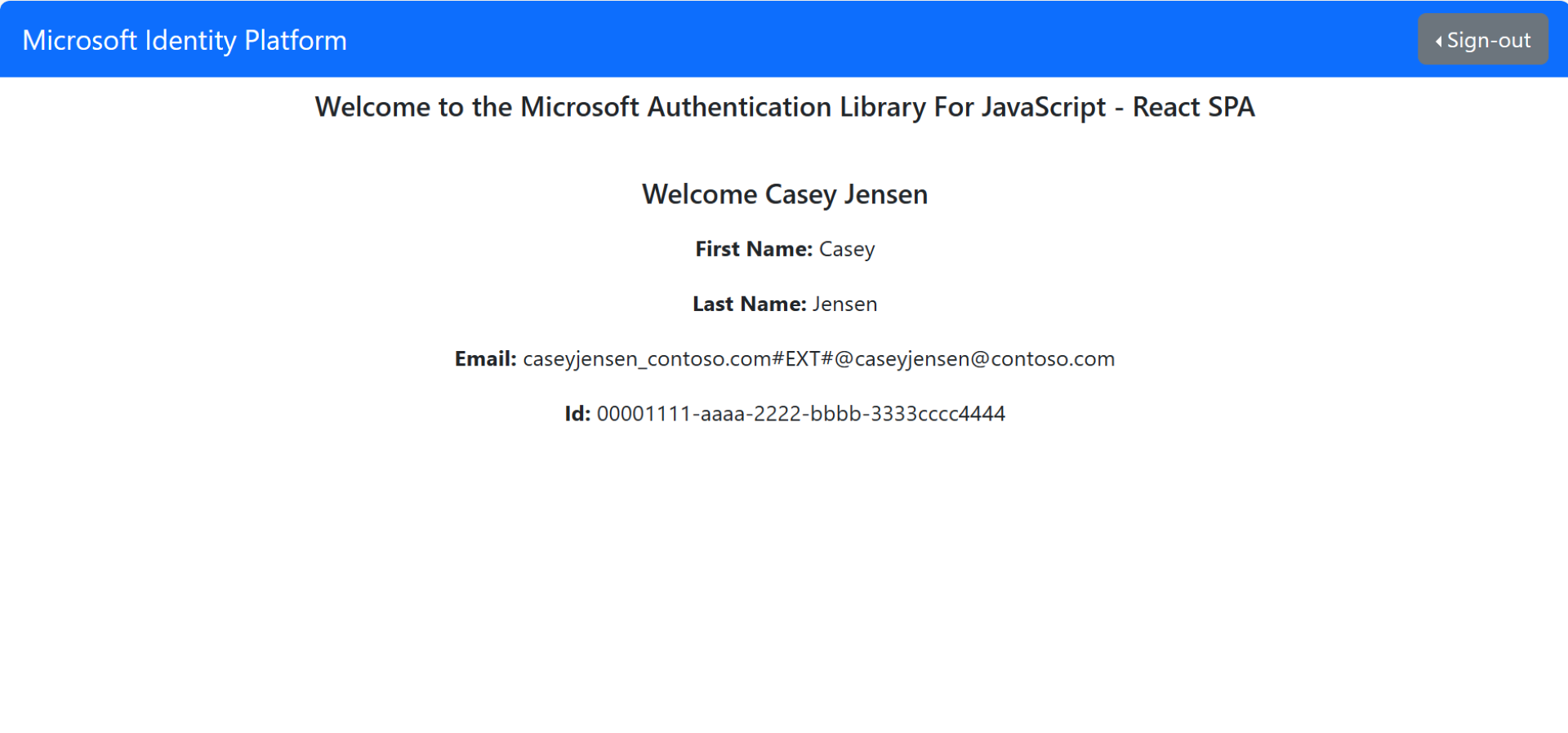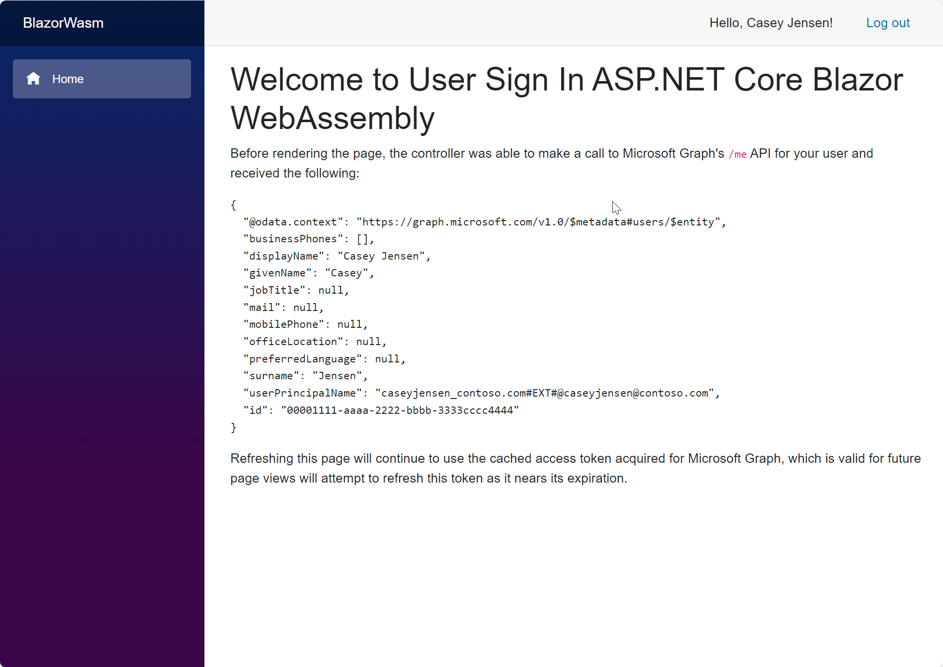 4. A captura de tela a seguir é exibida, indicando que você entrou no aplicativo e acessou os detalhes do perfil da API do Microsoft Graph.