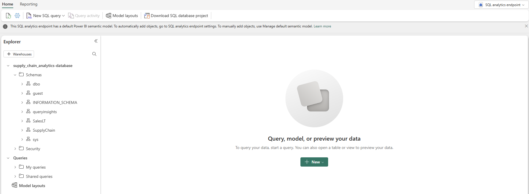 Verifique se você está no ponto de extremidade de análise do SQL e abra uma nova janela de consulta usando a barra de ícones que ilustra um papel com as letras SQL e cole o código Transact-SQL a seguir e selecione Executar para executá-lo. Essa consulta do T-SQL cria três novas exibições SQL, nomeadas