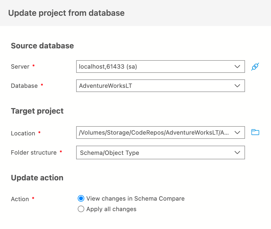 Para obter mais informações sobre a comparação de esquemas e projetos SQL, consulte a visão geral da comparação de esquemas.
