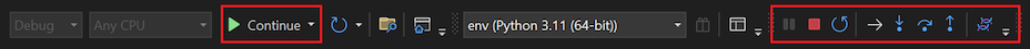 Enquanto o Depurador estiver em execução, percorra o código com F10 ou execute o código de cada ponto de interrupção com F5. Você também pode usar controles de depuração na barra de ferramentas principal no Visual Studio, como opções Continuar, Parar, Reiniciar e Etapa :