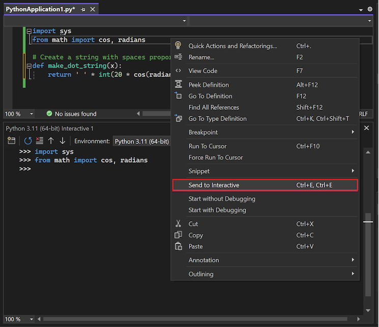 importno arquivo e selecione Enviar para a Interativa (ou o atalho de teclado Ctrl+E). Repita esse processo para a instruçãofrom.Quando você seleciona o comando Enviar para a Interativa, o fragmento de código selecionado é colado imediatamente na Janela Interativa e executado. Nesse caso, o Visual Studio importa as rotinas de