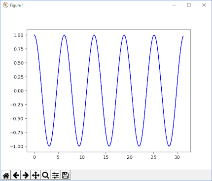 from math import radians import numpy as np # installed with matplotlib import matplotlib.pyplot as plt def main(): x = np.arange(0, radians(1800), radians(12)) plt.plot(x, np.cos(x), 'b') plt.show() main()No editor, passe o mouse sobre a instrução de importação