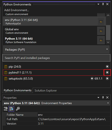 • Se você instalar o módulo usando o arquivo setup.py , execute o pip comando no ambiente python ativado para seu projeto python. Ao expandir o ambiente ativo do Python para seu projeto no Gerenciador de Soluções, você deverá ver uma entrada para o projeto C++, como o superfastcode.