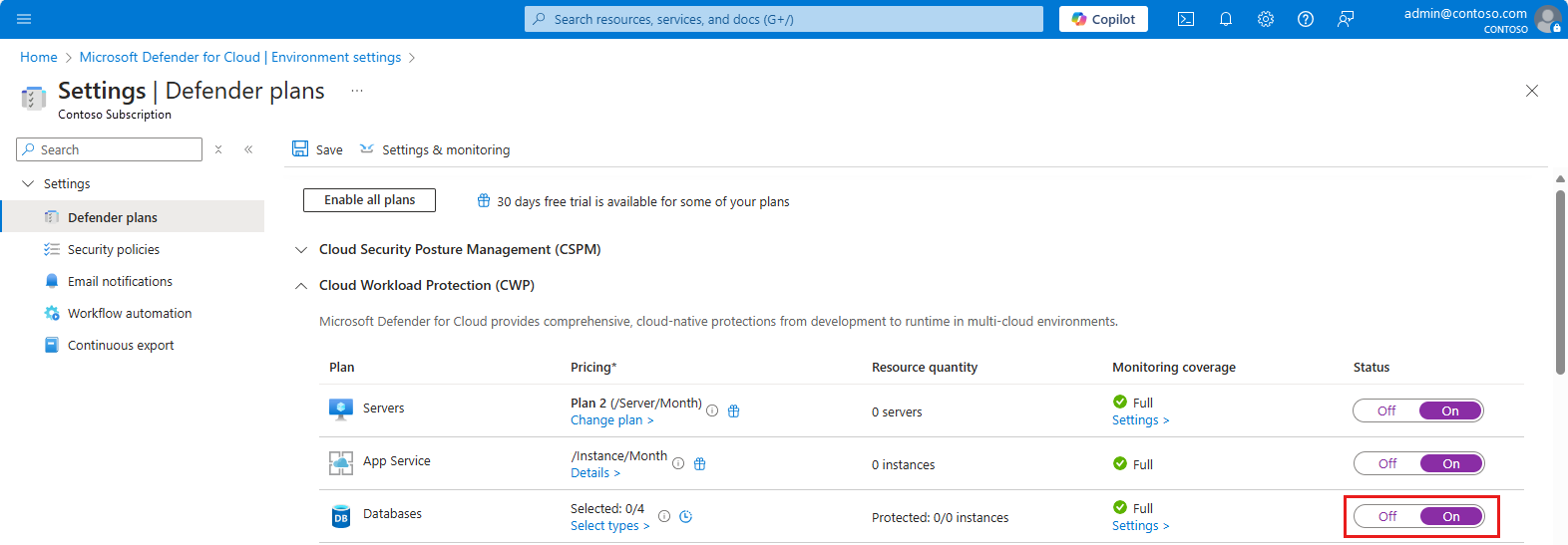 Na página Planos do Defender, alterne o plano Bancos de dados para Ativado.
