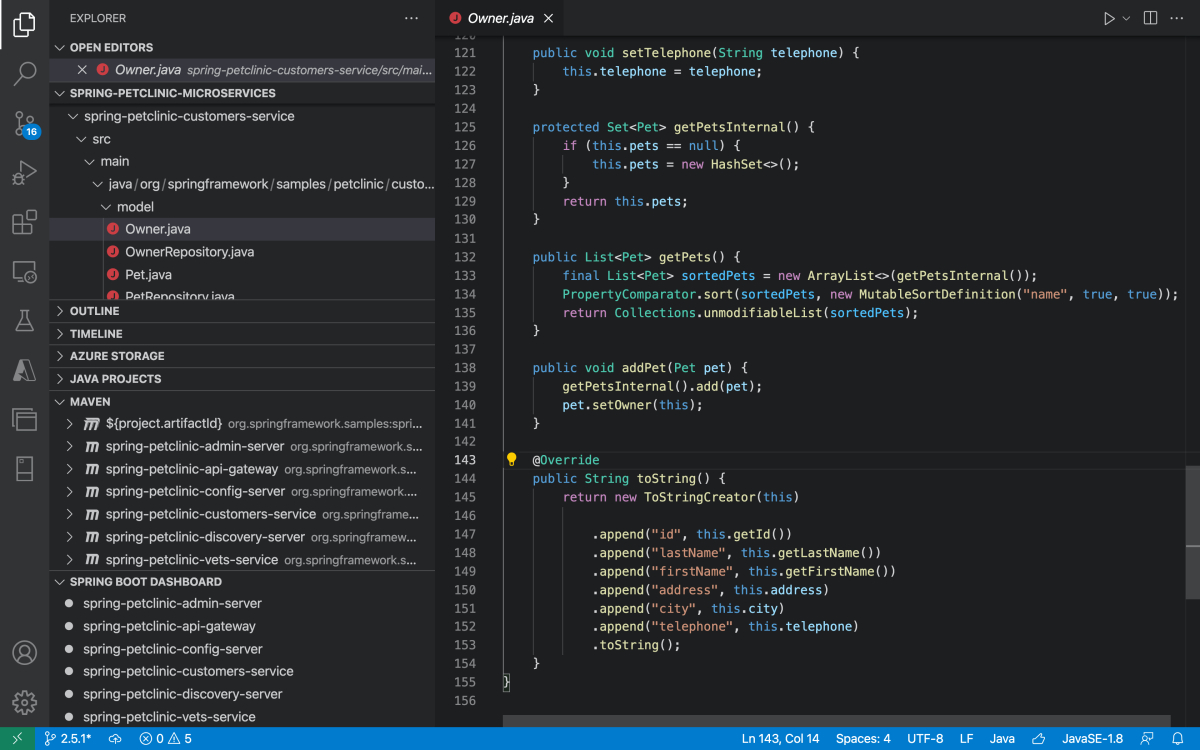 O VS Code suporta e simplifica fluxos de trabalho de desenvolvimento Java por meio de uma ampla gama de extensões Java para Visual Studio Code. Existem várias centenas de extensões apenas para Java, que você pode pesquisar de dentro do próprio IDE. Empacotamos extensões de chave para desenvolvimento Java fundamental no Extension Pack para Java. Este pacote de extensão inclui extensões para gerenciamento de projetos, integração Maven, edição de código, conclusão de código, navegação de código, refatoração, linting, formatação, depuração, execução e depuração de casos de teste JUnit/TestNG e muito mais. Há também um Spring Boot Extension Pack para desenvolver e implantar aplicativos Spring Boot - incluindo suporte a Spring Initializr.