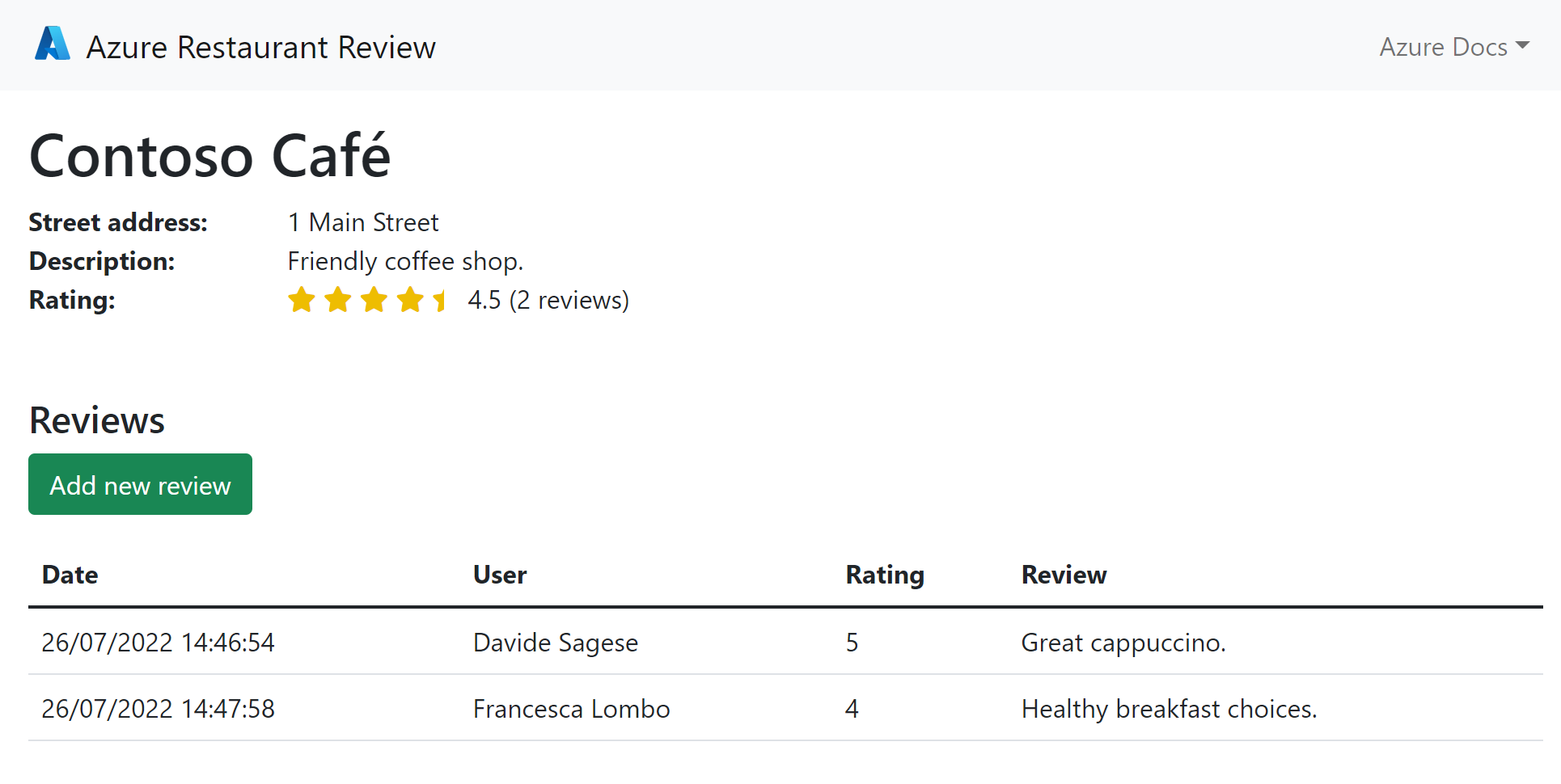 O resultado final deste tutorial é um aplicativo de revisão de restaurante, implantado e em execução no Azure, que se parece com a captura de tela a seguir.