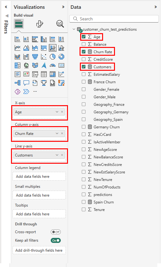 - Arraste a taxa de Churn do painel Dados para o campo Eixo y da coluna no painel Visualizações