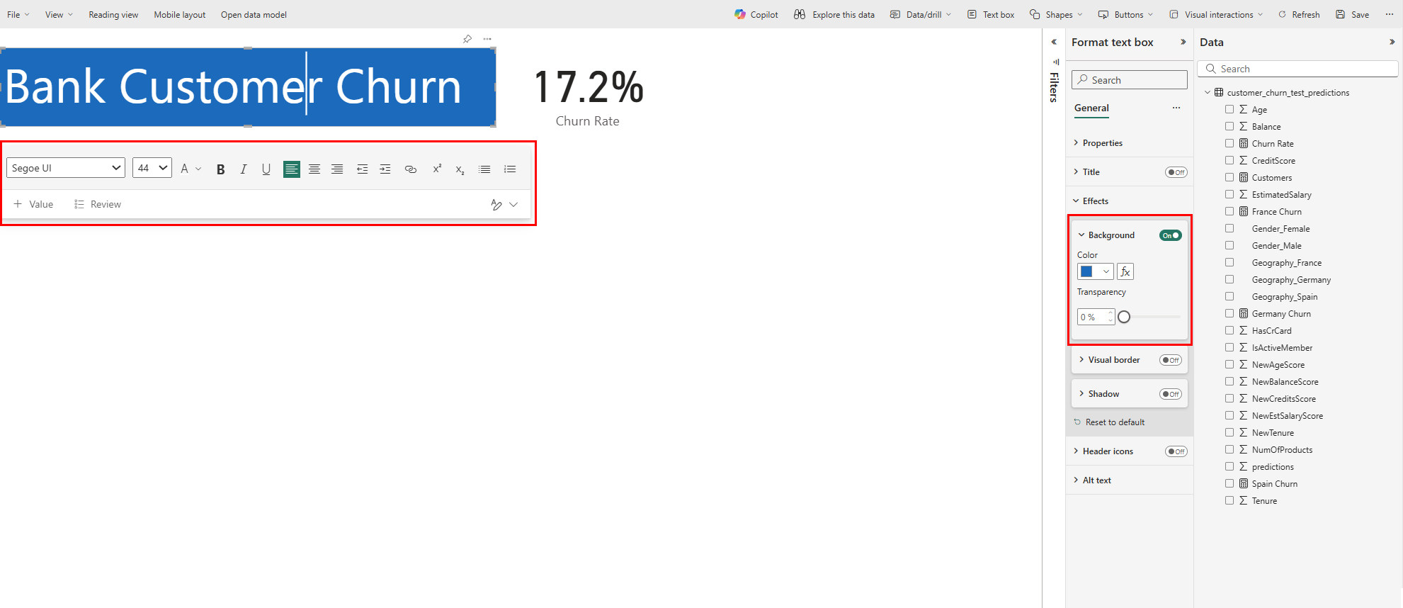 Measure =na barra de fórmulas por:Germany Churn = CALCULATE(AVERAGE(customer_churn_test_predictions[predictions]),FILTER(customer_churn_test_predictions, customer_churn_test_predictions[Geography_Germany] = TRUE()))Esta afirmação extrai as linhas que têm a Alemanha como geografia (Geography_Germany é igual a uma).