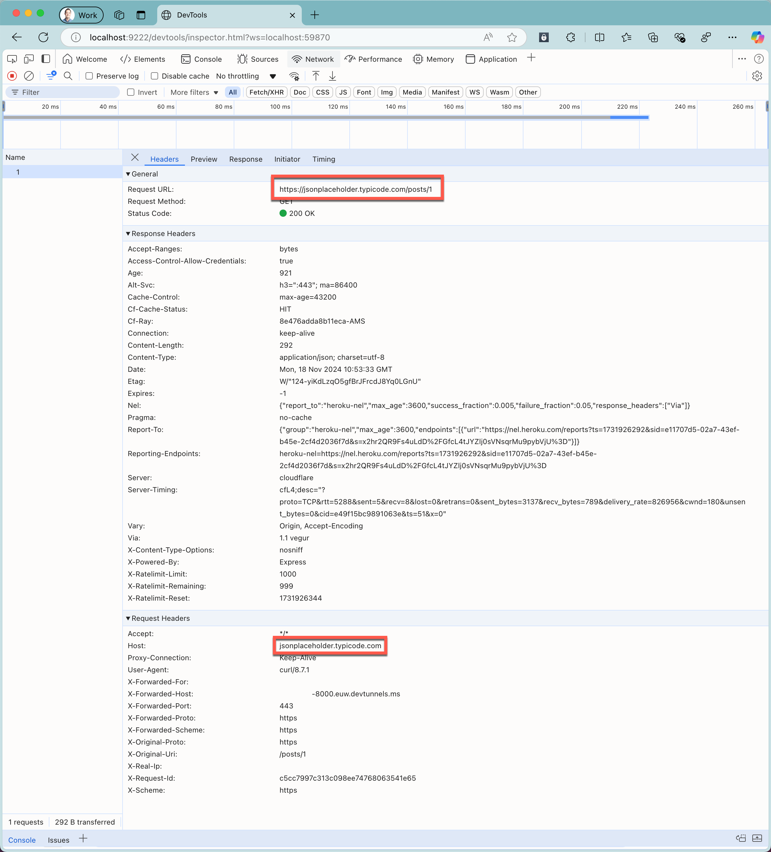 curl https://tunnel_id-8000.euw.devtunnels.ms/posts/1.No navegador da Web com as Ferramentas de Desenvolvimento do Chrome, observe as informações sobre a solicitação intercetada e a resposta da API na nuvem.