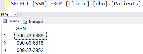 Captura de ecrã da consulta SELECT [SSN] FROM [Clinic].[dbo].[Patients] e os resultados da consulta apresentados como valores simples de texto.