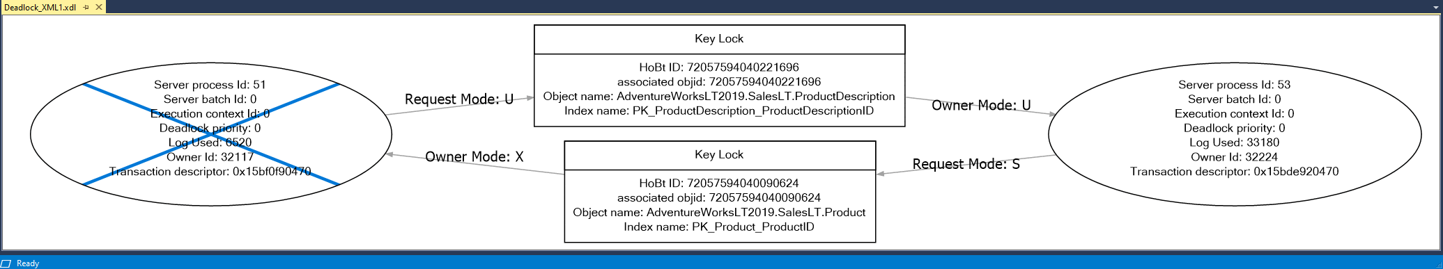 <process id="process12994344c58" taskpriority="0" logused="272" waitresource="XACT: 23:2476:0 KEY: 23:72057594049593344 (8194443284a0)" waittime="447" ownerId="3234906" transactionname="xactA" lasttranstarted="2025-10-08T21:36:34.063" XDES="0x12984ba0480" lockMode="S" schedulerid="2" kpid="204928" status="suspended" spid="95" sbid="0" ecid="0" priority="0" trancount="2" lastbatchstarted="2025-10-08T21:36:40.857" lastbatchcompleted="2025-10-08T21:36:34.063" lastattention="2025-10-08T21:36:11.340" clientapp="Microsoft SQL Server Management Studio - Query" hostname="WS1" hostpid="23380" loginname="user1" isolationlevel="read committed (2)" xactid="3234906" currentdb="23" currentdbname="AdventureWorksLT" lockTimeout="4294967295" clientoption1="671090784" clientoption2="390200">