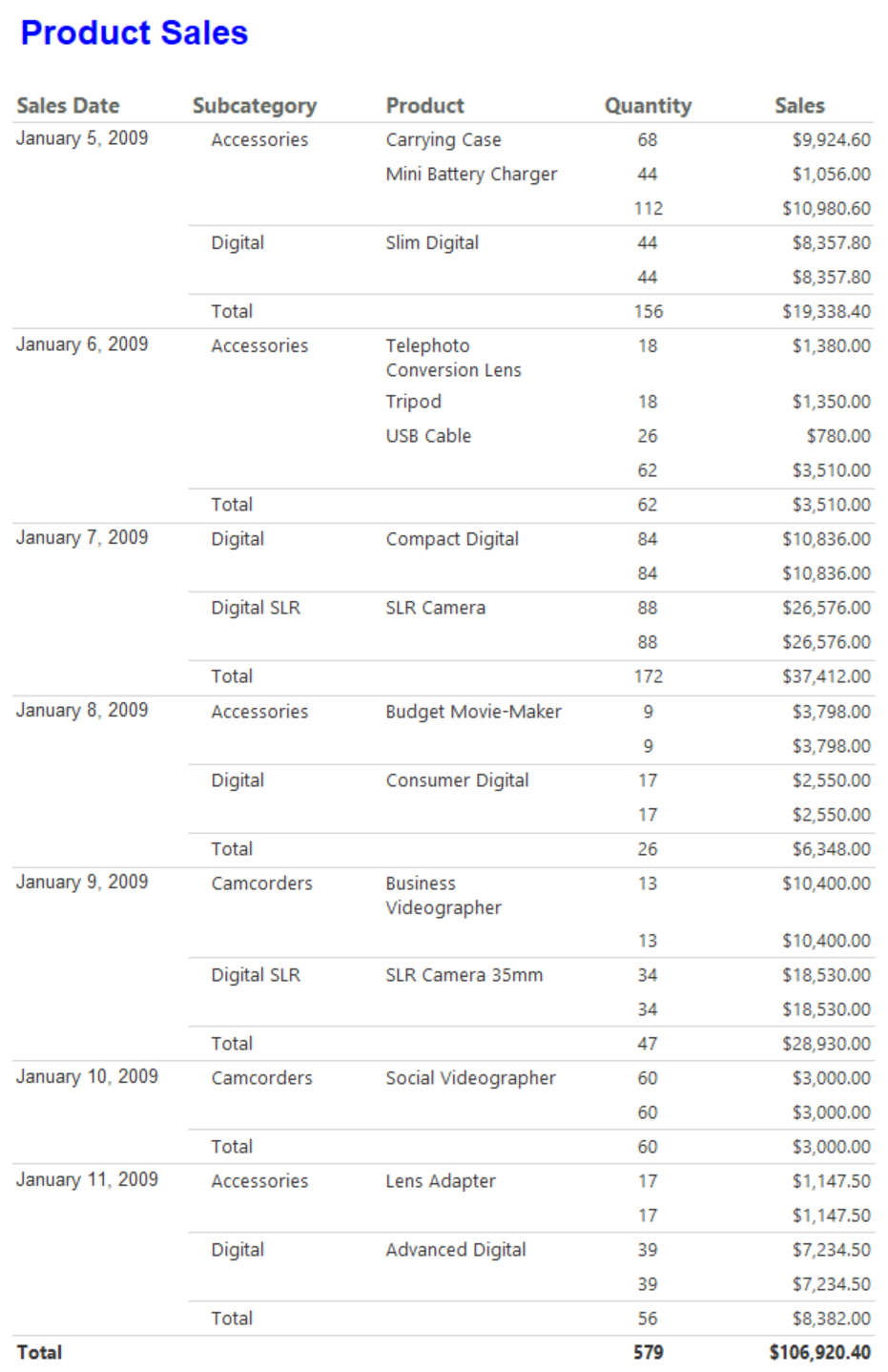 Confirme se os valores na coluna SalesDate são exibidos somente como datas (mês, dia, ano). Veja aqui um exemplo do relatório: