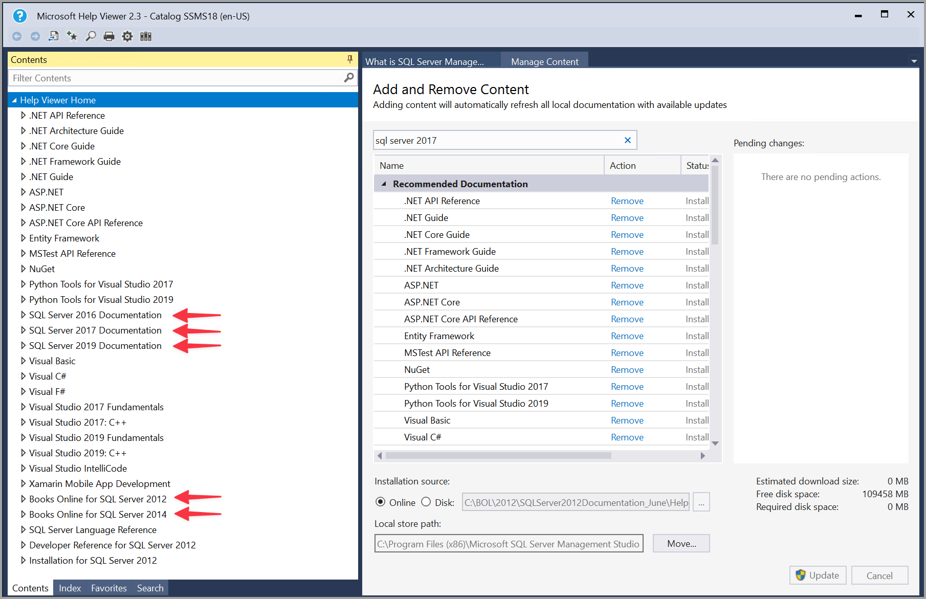 Para encontrar o conteúdo de ajuda mais recente para SQL Server 2016 (13.x) e versões posteriores, no separador Gerir Conteúdo , escolha Online na fonte de instalação e depois escreva sql server na barra de pesquisa.