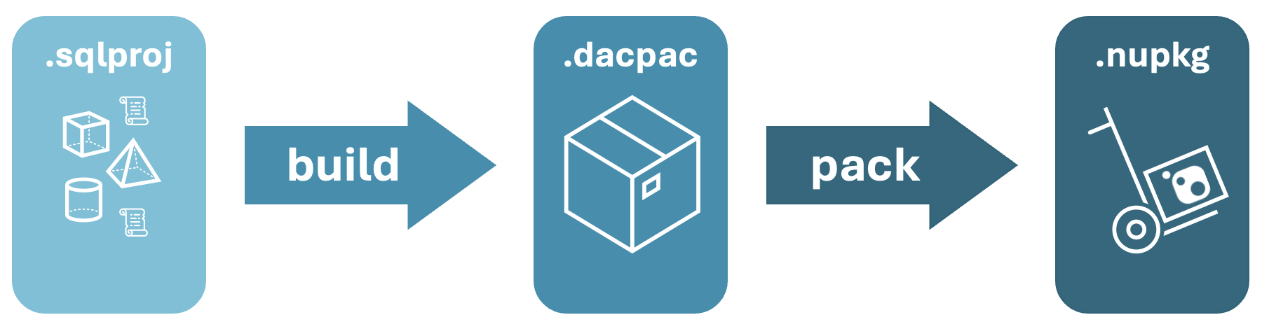 Para empacotar um arquivo .sqlproj como um pacote NuGet, use o comando dotnet pack na linha de comando. Por padrão, o comando dotnet pack cria um pacote NuGet a partir do arquivo .sqlproj na pasta bin/Debug.