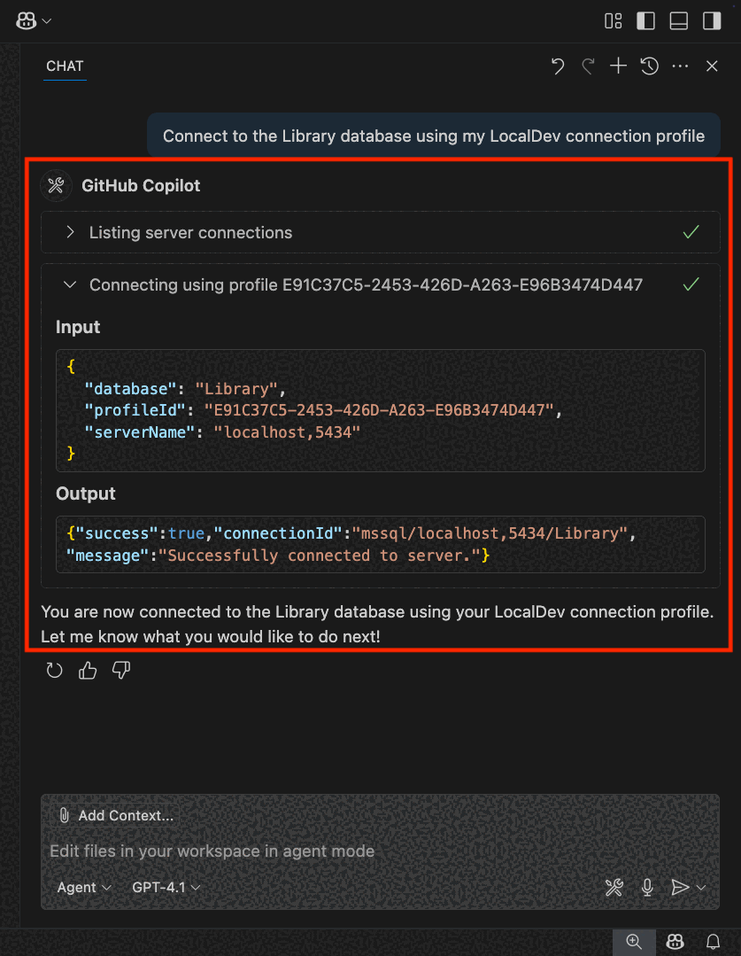 Você também pode usar variáveis de bate-papo, como #mssql_connect invocar essas ferramentas diretamente, ou escrever prompts em linguagem natural, como: