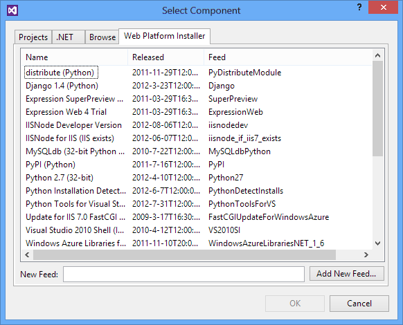 Você pode adicionar referências a entradas de produto WebPI (Web Platform Installer) para implantação nos Serviços de Nuvem do Microsoft Azure, onde você pode instalar mais componentes por meio do feed WebPI. Por padrão, o feed exibido é específico do Python e inclui Django, CPython e outros componentes principais. Você também pode selecionar seu próprio feed, conforme mostrado na imagem a seguir. Quando você publica no Microsoft Azure, uma tarefa de instalação instala todos os produtos referenciados.