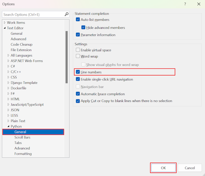 Por padrão, os números das linhas não aparecem no editor. Para ver os números das linhas, selecione Ferramentas>Opções, expanda a secção Todas as Definições>Linguagem>Python>Geral e selecione a opção Números de Linha: