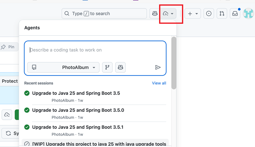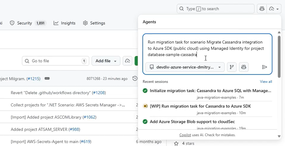 Откройте панель "Агенты" в правом верхнем углу и введите запрос. После ввода команды Copilot запускает новый сеанс и открывает новый pull request, который отображается в списке под полем запроса. Copilot работает над задачей, а затем добавляет вас в качестве рецензента после завершения, активируя уведомление.