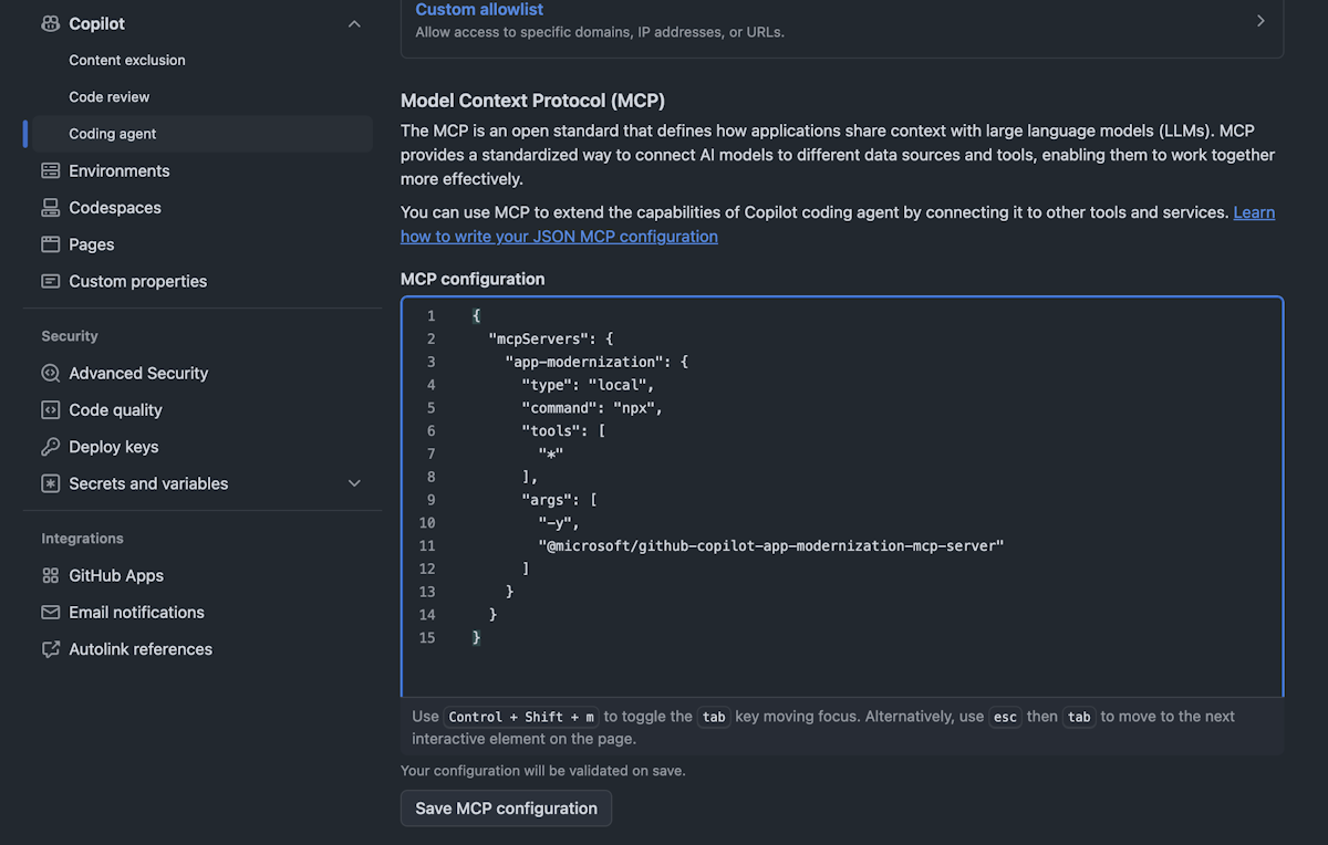 { "mcpServers": { "app-modernization": { "type": "local", "command": "npx", "tools": [ "*" ], "args": [ "-y", "@microsoft/github-copilot-app-modernization-mcp-server" ] } } }(Необязательно) Если необходимы переменные среды, задайте их в разделе Environment>Copilot в параметрах. Эти переменные среды инициализированы автоматически при первом вызове задачи агента в этом репозитории.
