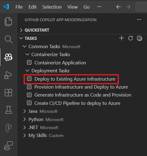В разделе "Задачи " откройте "Задачи развертывания " и выберите "Развернуть в существующей инфраструктуре Azure".