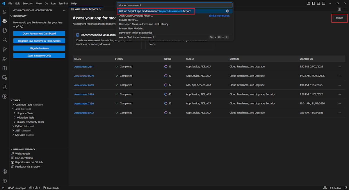 Чтобы импортировать отчет об оценке в модернизацию GitHub Copilot, выберите "Импорт " на странице отчетов об оценке или нажмите клавиши CTRL+SHIFT+P , а затем найдите отчет об оценке импорта.