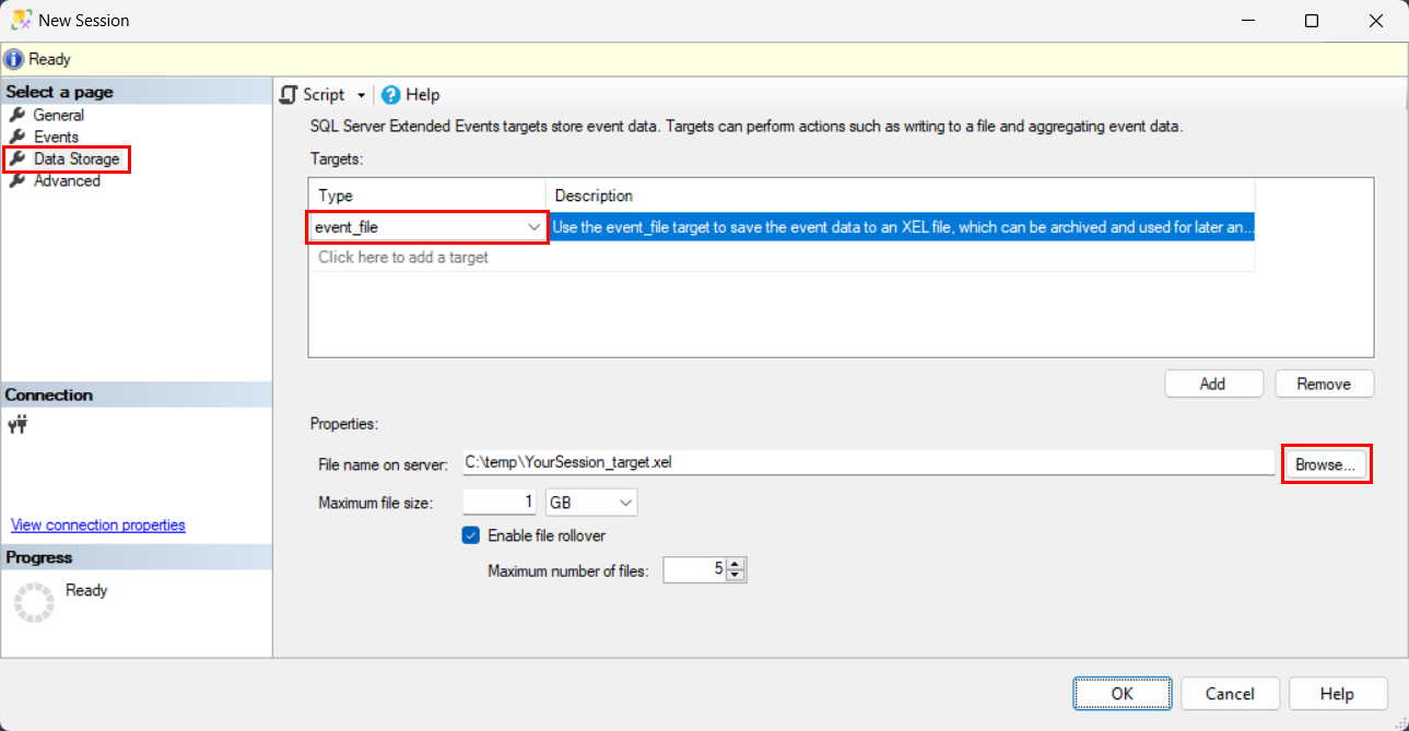 xel. В нашем примере мы использовалиC:\temp\YourSession_Target.xel.Выберите страницу "Дополнительно ". По умолчанию этот Xel-целевой объект расширенного сеанса событий не должен влиять на производительность сервера, но эти параметры на странице "Дополнительно " можно использовать для увеличения или уменьшения ресурсов и задержки.