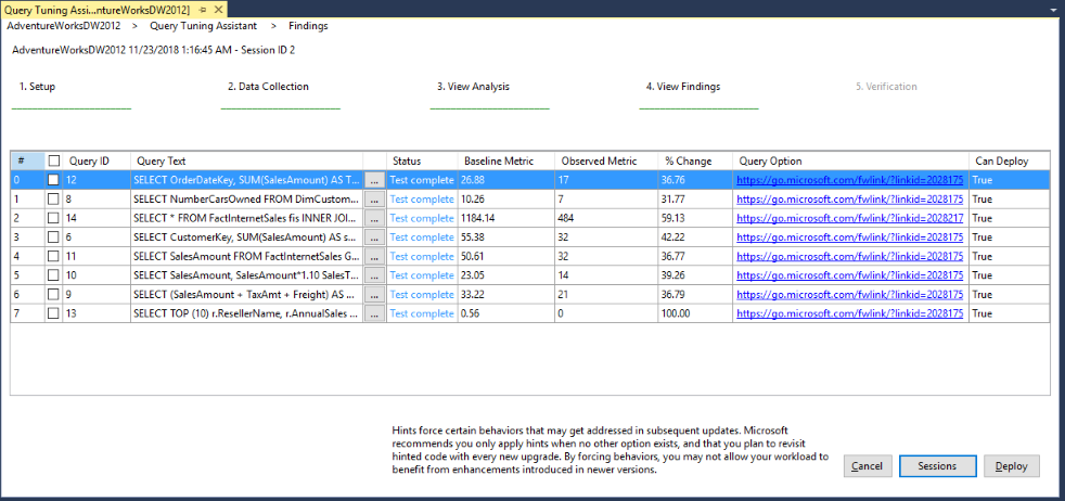Начиная с SQL Server Management Studio версии 18 функция помощника по настройке запросов (QTA) позволяет пользователям использовать рекомендуемый рабочий процесс, чтобы обеспечить стабильность производительности во время обновления до более новых версий SQL Server, как описано в разделе "Сохранить стабильность производительности во время обновления до более новыхсценариев использования хранилища запросов SQL Server". Тем не менее QTA не выполняет откат к ранее известному удачному плану, как показано на предыдущем шаге рекомендуемого рабочего процесса. Вместо этого QTA отслеживает все регрессии, обнаруженные в представлении Query Store Regressed Queries, и перебирает возможные вариации применимых моделей оптимизатора, чтобы создать новый, более эффективный план.