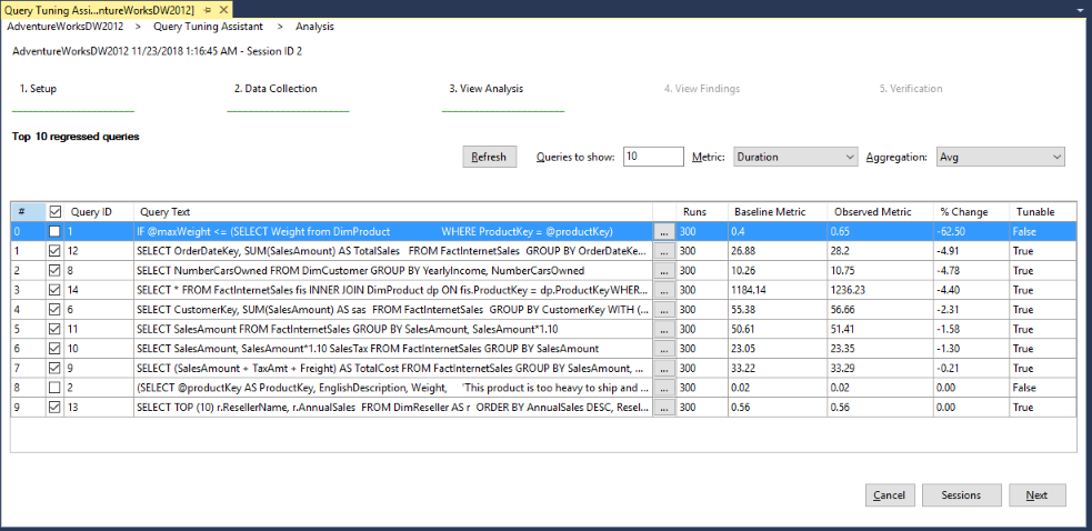 Сбор наблюдаемых данных запрашивает у пользователя повторное выполнение цикла репрезентативной рабочей нагрузки, чтобы хранилище запросов могло собирать сравнительную базу, используемую для поиска возможностей оптимизации. При выполнении рабочей нагрузки нажимайте кнопку Обновить, чтобы обновлять список регрессионных запросов (если они будут найдены). Измените значение Queries to show (Число отображаемых запросов), чтобы ограничить число отображаемых запросов. Порядок элементов в списке зависит от значений параметров Метрика ("Продолжительность" или "Время ЦП") и Статистическая обработка ("Среднее" — значение по умолчанию). Кроме того, задайте значение параметра Queries to show (Число отображаемых запросов). После завершения этой рабочей нагрузки проверьте \"Выполнено\" и нажмите \"Далее\".