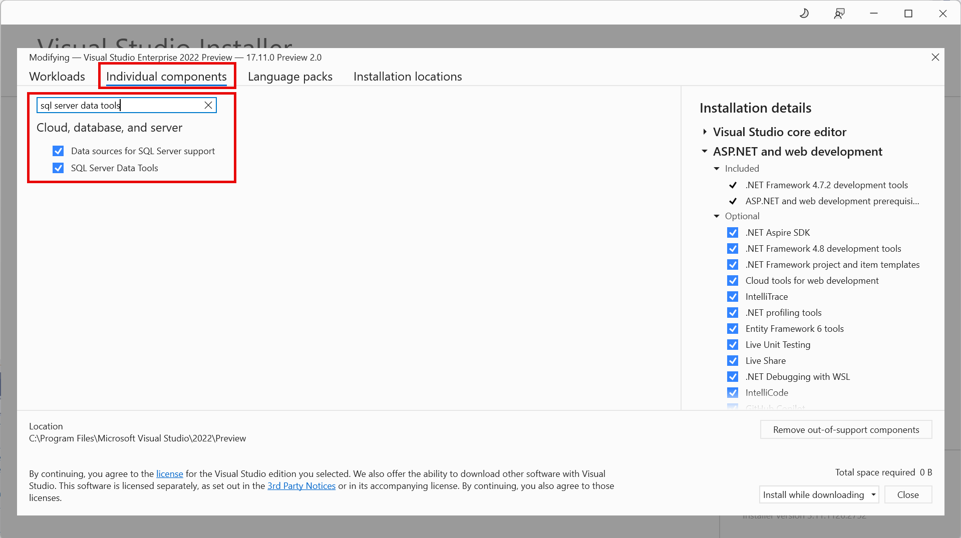 Заметки о выпуске SSDT и его компоненты доступны для Visual Studio 2017, 2019, 2022 и 2026. Обзор основных функций SSDT представлен в обзоре SSDT.