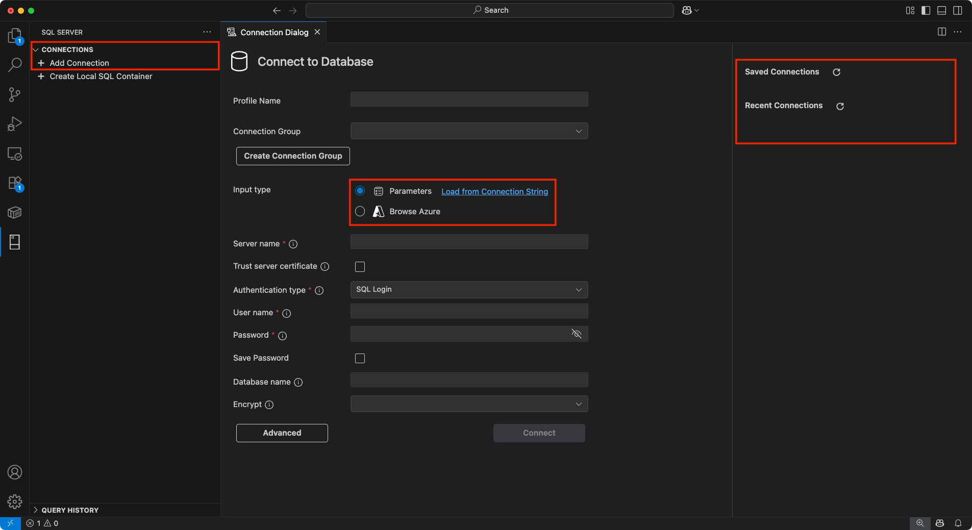 В качестве альтернативы можно ввести строку подключения ADO для своей базы данных.Надежный сертификат сервера Проверьте это поле. Выберите этот параметр, чтобы доверять сертификату сервера. Тип входных данных Параметр. Выберите параметр, строку подключения или просмотр Azure. Имя базы данных (необязательно) <По умолчанию.> База данных, которую необходимо использовать. Чтобы подключиться к базе данных по умолчанию, не указывайте имя. Тип проверки подлинности Вход SQL. Выберите вход SQL, аутентификацию Windows или Microsoft Entra ID. Имя пользователя <Введите имя пользователя> для SQL Server. Если выбран Вход SQL, введите имя пользователя с доступом к базе данных на сервере. Пароль <Введите пароль> для SQL Server. Введите пароль для указанного пользователя. Сохранить пароль Проверьте это поле, чтобы сохранить пароль для будущих подключений. Нажмите клавишу ВВОД, чтобы выбрать вариант Да и сохранить пароль. Выберите Нет, чтобы пароль запрашивался при каждом использовании профиля подключения. Шифровать Обязательно. Выберите " Да", "Нет" или "Обязательный". После ввода всех значений и нажатия клавиши ВВОД Visual Studio Code создает профиль подключения и подключается к SQL Server.