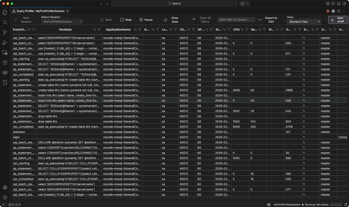 Профилировщик запросов в расширении MSSQL для Visual Studio Code записывает и отслеживает активность базы данных в режиме реального времени с помощью расширенных событий. Вы можете наблюдать динамическое действие T-SQL, определять медленные операции и находить узкие места производительности во время разработки.