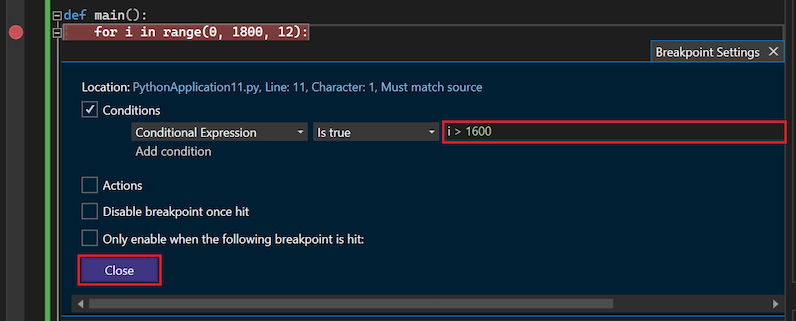 Ниже показано, как определить условие точки останова в инструкции цикла for, чтобы отладчик приостанавливается только в том случае, если значение переменной i превышает 1600: