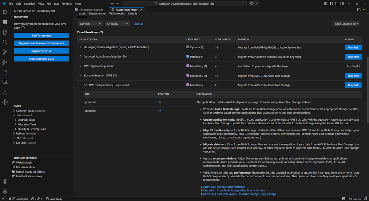 - Välj Starta utvärdering eller Öppna utvärderingsinstrumentpanelen i avsnittet SNABBSTART i gitHub Copilot-moderniseringsfönstret.