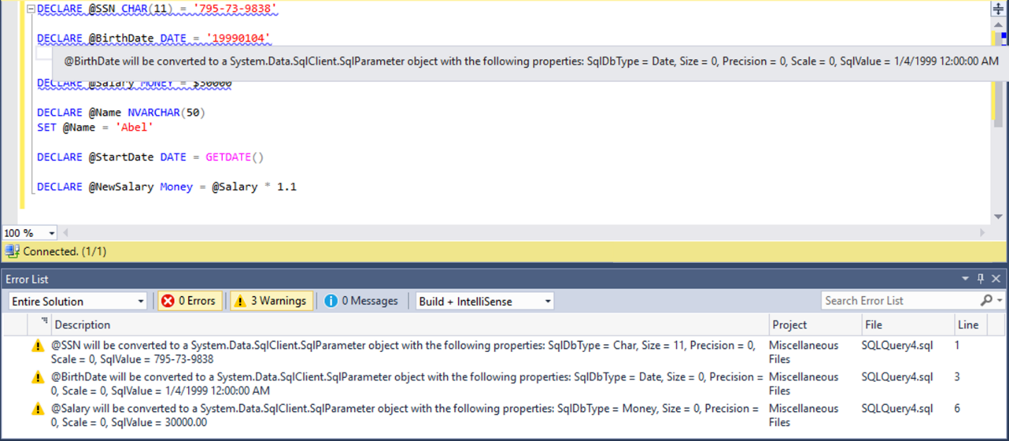 En deklaration av en variabel som kan parametriseras markeras med en varningslinje i frågeredigeraren. Om du hovrar på en deklarationssats som har markerats med en varningsstrykning, du ser resultatet av parametriseringsprocessen, inklusive värdena för de viktiga egenskaperna för det resulterande SqlParameter- -objektet (variabeln mappas till): SqlDbType, Size, Precision, Scale, SqlValue. Du kan också se den fullständiga listan över alla variabler som har parameteriserats på fliken Varning i vyn Fellista. Om du vill öppna vyn fellista väljer du Visa på huvudmenyn och väljer sedan fellista.