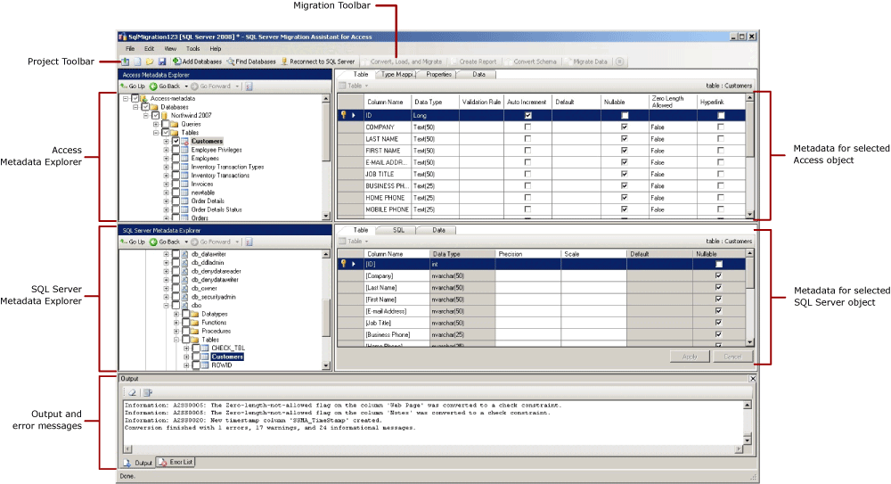När du har installerat SSMA är det bra att bekanta dig med SSMA-användargränssnittet innan du använder verktyget för att migrera Åtkomstdatabaser till SQL Server eller Azure SQL Database. Följande diagram visar SSMA-användargränssnittet, inklusive metadatautforskaren, metadata, verktygsfält, utdatafönstret och fönstret för fellistan: