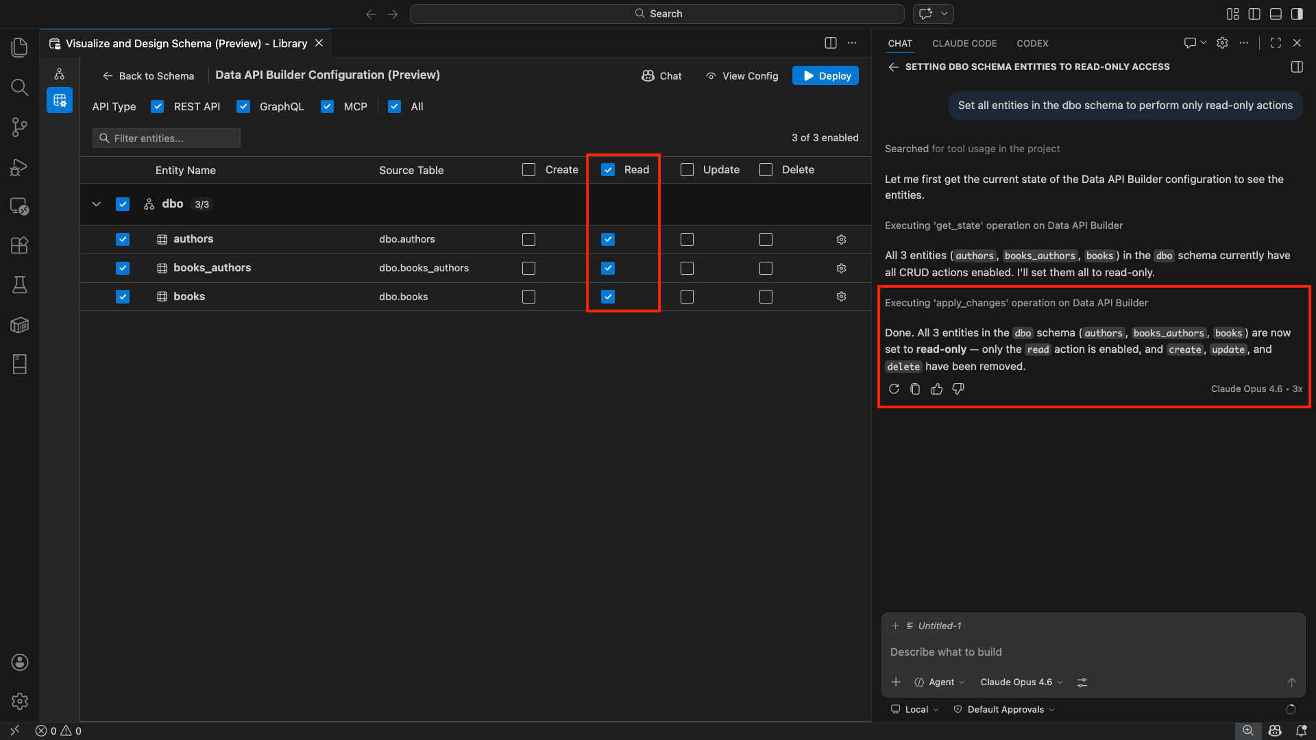 "Enable all SalesLT entities for read operations""Expose only the Customer and Product tables with full CRUD permissions""Set all entities in the dbo schema to read-only""Disable the BuildVersion and ErrorLog entities""Can you also enable MCP for the Data API builder API?"