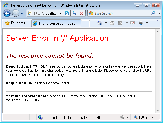 如果尝试通过在浏览器的地址栏中键入 /Work/CompanySecrets 来调用 CompanySecrets () 控制器操作,则会在图 1 中收到错误消息。