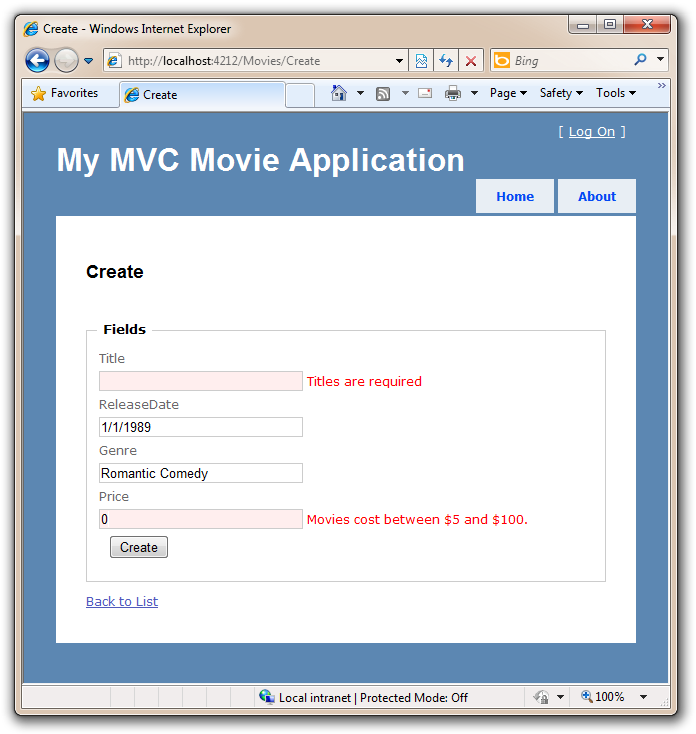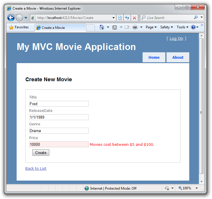 Re-Run应用程序并尝试输入价格超过 100 的电影。 提交表单后,将收到错误。 此错误在服务器端捕获,并在窗体为 POSTed 之后发生。 请注意 ASP.NET MVC 的内置 HTML 帮助程序如何足够智能地显示错误消息并在文本框元素中维护值:
