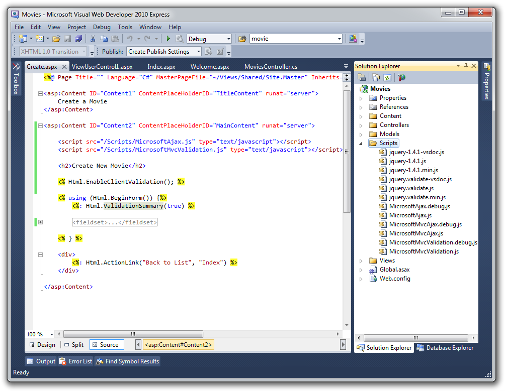 在 VWD 中,转到“视图/电影”文件夹并打开 Create.aspx。