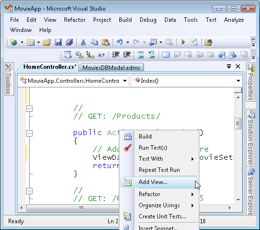 - 右键单击代码编辑器中的 Edit() 方法,然后选择菜单选项 “添加视图 ”(请参阅图 14)。