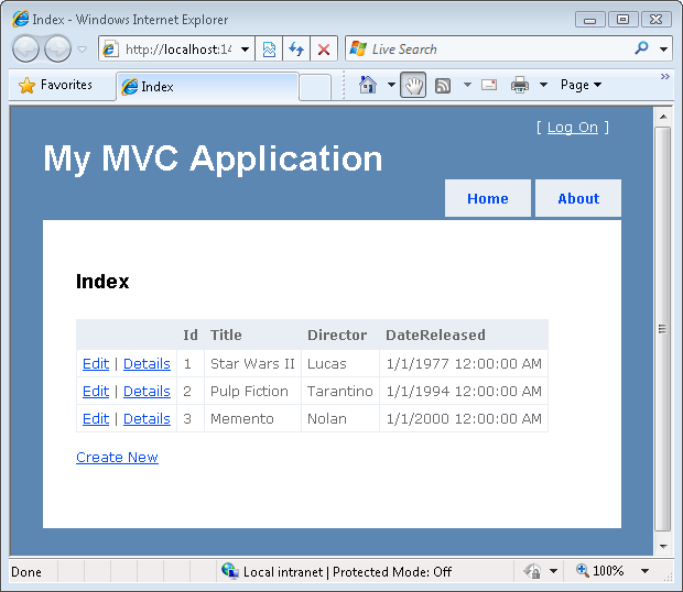 我们在上一节中创建的索引视图包括用于创建新数据库记录的链接。 让我们继续实现逻辑,并创建创建新电影数据库记录所需的视图。