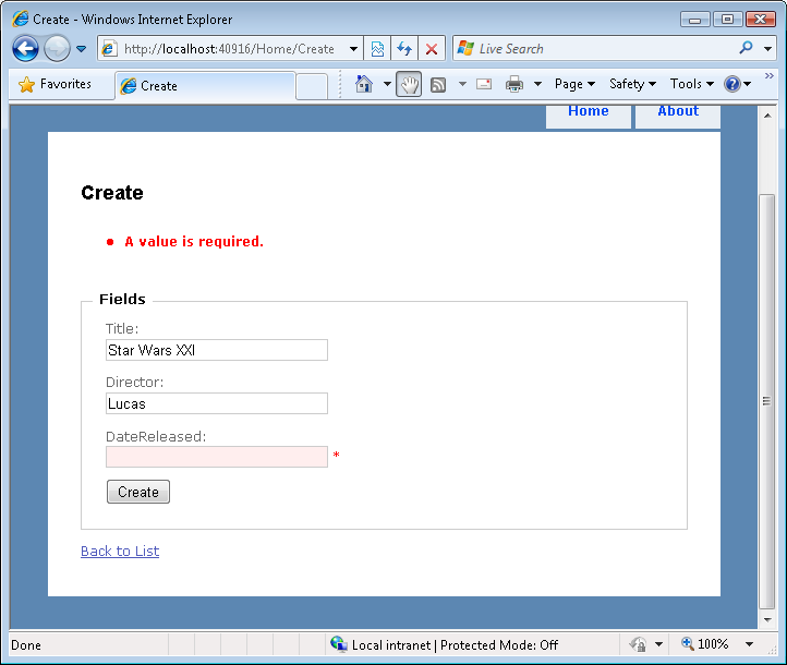 请注意,会自动获得表单验证。 如果忽略输入电影的发布日期,或者输入无效的发布日期,则会重新显示窗体,并突出显示发布日期字段。